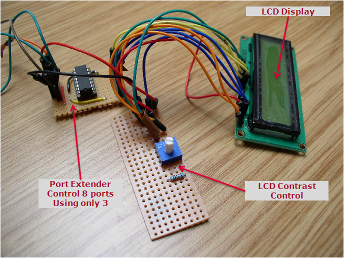 This shows the LCD assembly. Top left is the 'Port Extender'; here I use a shift register to create 8 logical ports from 3 inputs (clock, data and latch of the register).